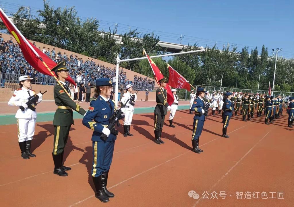 彩旗方队的队员们步伐整齐,精神昂扬。挥臂,展旗,动作一气呵成。舞动的彩旗,是军训场上一道流动的风景线。