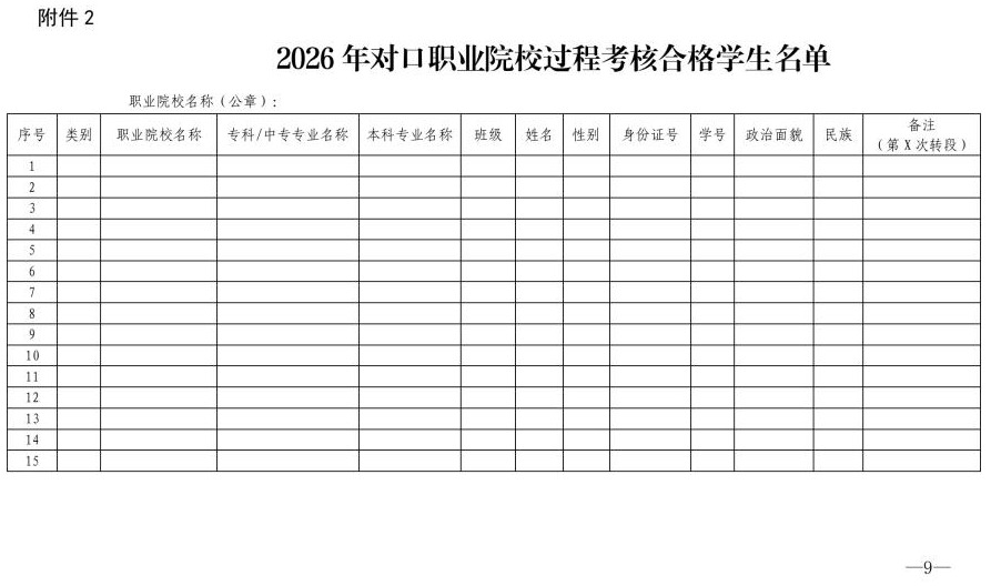 ( 一)严格对转段考生的过程性考核。对口职业院校负责对转段考生进行过程考核,考核结果在职业院校内进行公示。公示期满无异议后,于 11 月 17 日前将 2026 年对口职业院校过程考核合格学生名单(附件 2)电子版及盖章的纸质 版 报 我 校 招 生 就 业 处 袁 晓 轩 处 (联 系 电 话 : 0531-80687112)。上报学生名单应包括职业院校名称、专科/中专专业名称、 本科专业名称、班级、姓名、性别、身份证号、学号、政治面貌、民族、备注(第X 次转段)等。